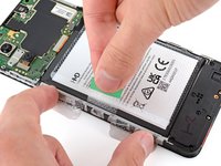 Gebruik je, indien de lijm in de batterij-inkeping niet goed meer plakt, een spudger en een pincet om de twee kleefstrips te verwijderen. Vervolgens plak je de nieuwe kleefstrips op het frame en verwijder je de beschermfolie.